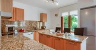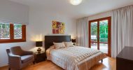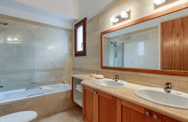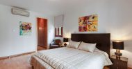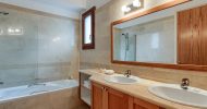 Главная спальня имеет двуспальную кровать, прикроватные тумбочки с лампами, встроенные шкафы и мраморную ванную комнату с 2 умывальниками, ванной и туалетом.