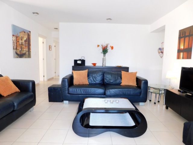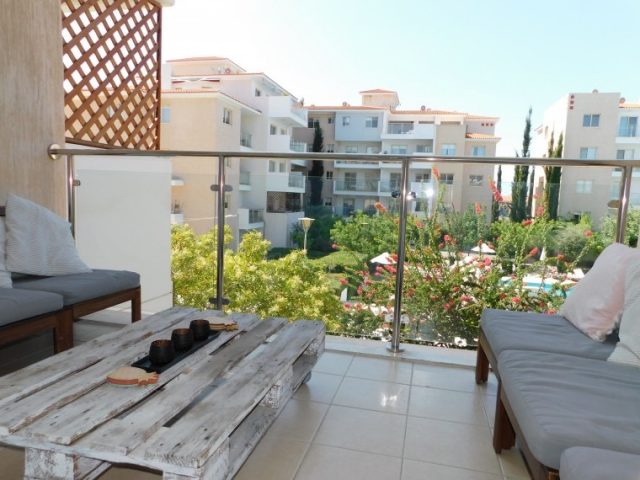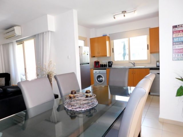 The property has an open plan spacious living and dining areas and separated cosy kitchen. From the living area there is access to a large balcony with pool view. There are 3 double large bedrooms with fitted wardrobes, master bedroom has en-suite facilities. Family bathroom concludes the property. The apartment is in excellent condition, equipped with electrical appliances and A/Cs, sold fully furnished and equipped. Private covered and uncovered parking and storage are available.