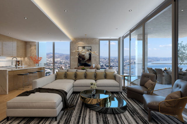 The high-rise building is located in the heart of Limassol, surrounded by upscale hotels, cafes, boutiques, and a world-class marina is at a stone’s throw.