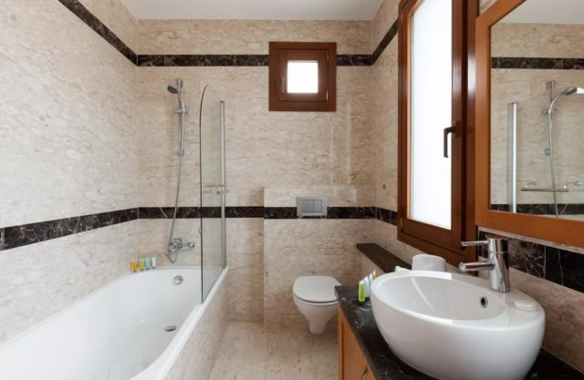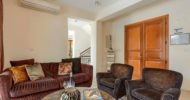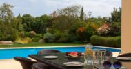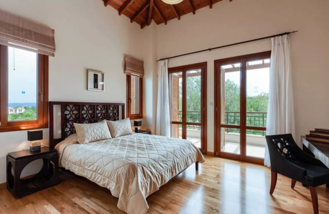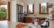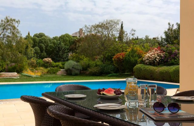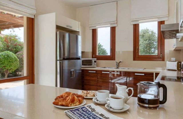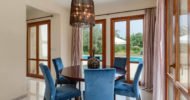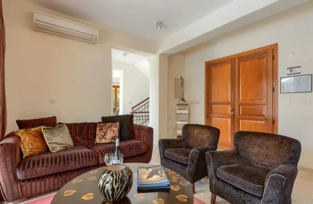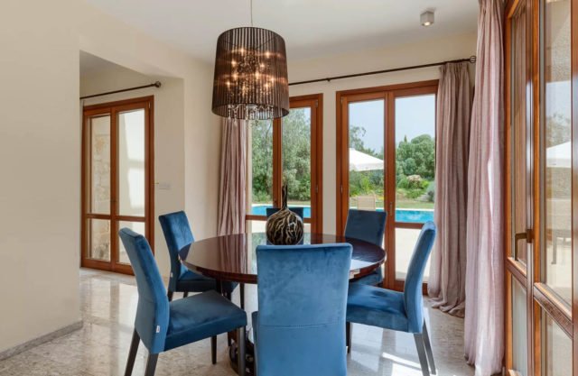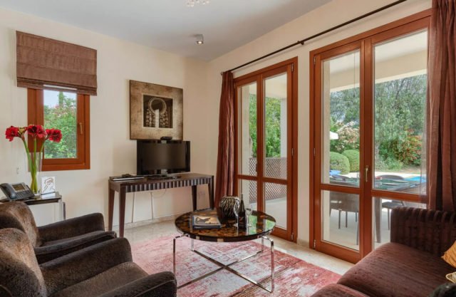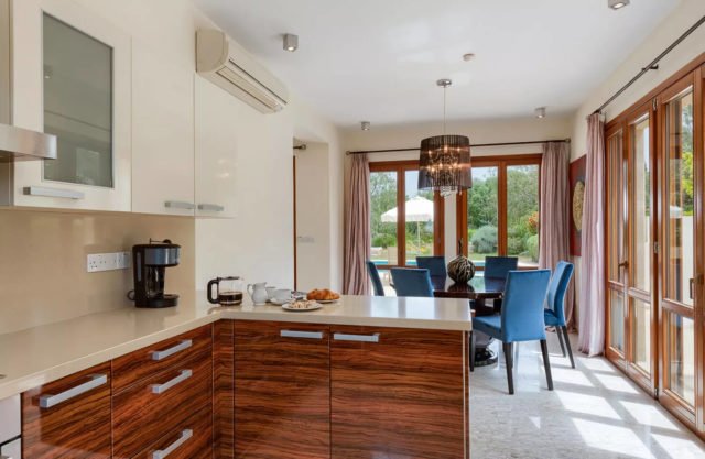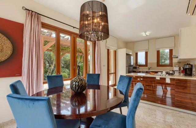 The living area of the villa, which is located on the ground floor, features a two-seater sofa and two armchairs. The room is filled with natural daylight from the French doors which lead out onto the terrace. Just the other side of the marble staircase is the dining area, which boasts a large round wooden table with seating for six people. The kitchen, constructed from Italian wood and granite and fully equipped with stainless steel appliances from a dishwasher to a double door American fridge freezer, is situated just off the dining area.