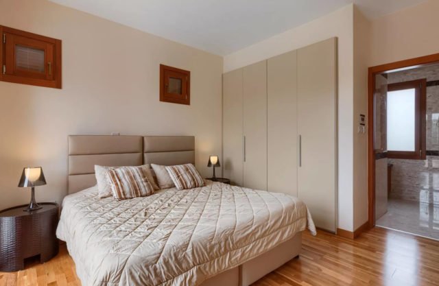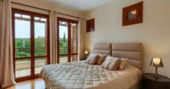 On the first floor, the master bedroom boasts a large double bed with side cabinets, which also has the possibility to be set-up as two singles, a vanity table, ample closet space and a private en-suite marble bathroom, featuring a jetted spa bath with a shower, a built-in shower cubicle and a double sink vanity unit. In addition, the master bedroom enjoys ample closet space and is completed by two French doors leading onto the balcony.