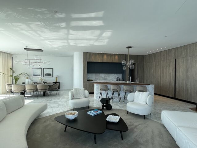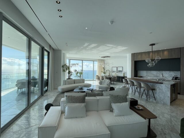 Когда вы входите в апартаменты, перед вами открывается просторная гостиная открытой планировки, демонстрирующая потрясающее сочетание дизайна и функциональности. Залитое солнцем пространство подчеркнуто окнами от пола до потолка, которые обеспечивают плавный переход на просторный балкон, холст для очаровательных морских пейзажей и лазурных горизонтов.