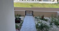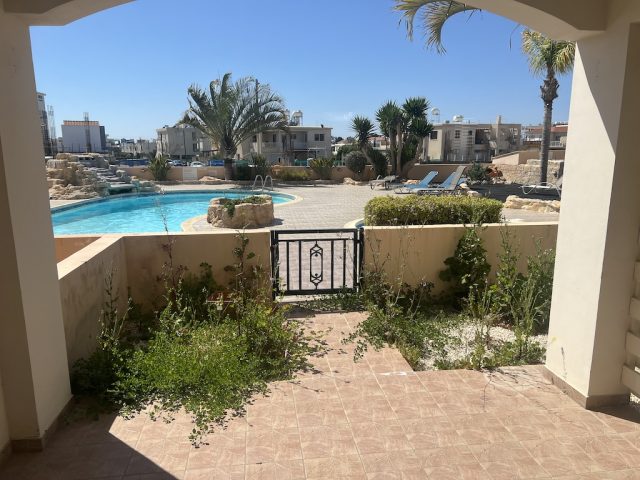 The apartment features two private courtyards – one leading directly to the lush communal swimming pool area, perfect for relaxation, while the second offers a quieter space with views of the green surroundings, ideal for outdoor dining or entertaining.