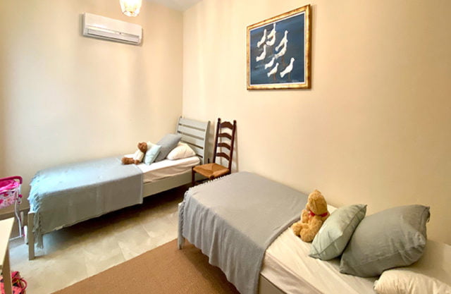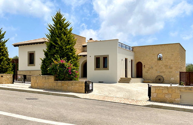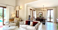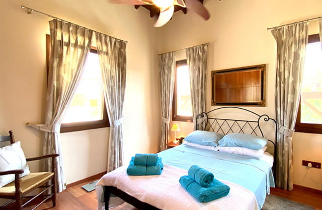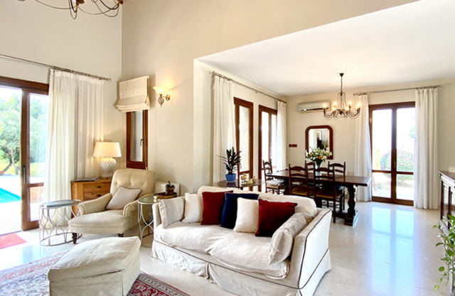 Большие арочные входные двери ведут в большую гостиную и столовую. Высокий деревянный потолок и камин из кипрского камня — главные особенности гостиной. Вилла оснащена кондиционерами и радиаторами газового отопления.