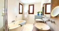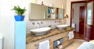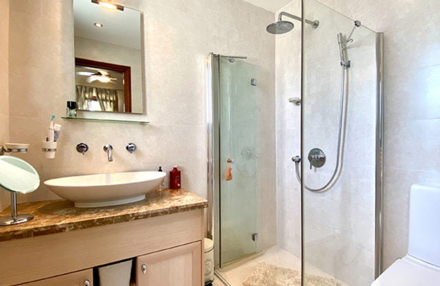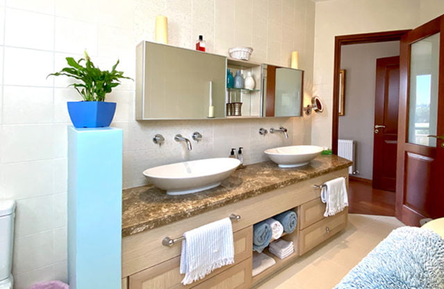 Дверь из гостиной ведет в главную спальню с ванной комнатой. В ванной комнате есть двойная раковина с зеркальными шкафчиками над ней, отдельно стоящая ванна, отдельный душ и туалет. Просторная гостевая спальня находится на втором этаже. Третья спальня расположена на цокольном этаже. Там же находиться кабинет. В шкафу под лестницей есть сейф и место для хранения вещей.