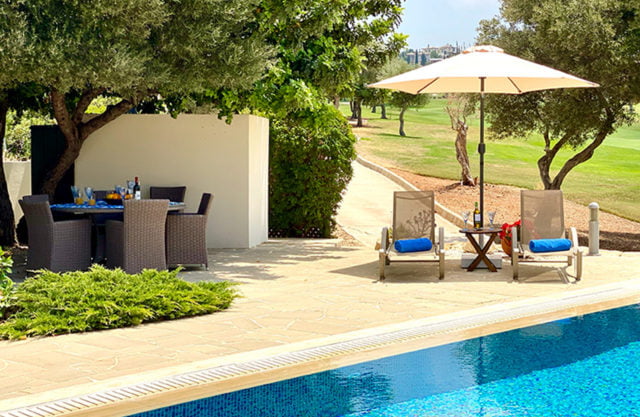 Эта вилла с тремя спальнями и частным бассейном расположена в тихом жилом районе курорта Афродита Хиллс. С большой террасы виллы открывается вид на четвертую лунку поля для гольфа.