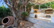 A separate illuminated arbour for barbecue with a sink, barbecue, and a traditional stove.