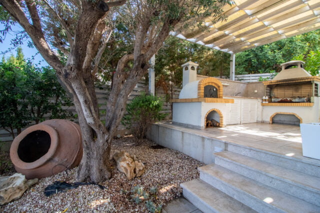 There is a swimming pool with outside shower with hot water and well-maintained garden with fruit-bearing trees and good landscape design with the correct backlighting.