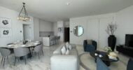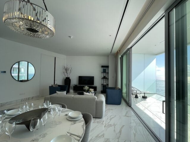 As you enter the apartment, you are greeted by a spacious open plan living area, showcasing a stunning combination of design and functionality. The sun-drenched space is highlighted by floor-to-ceiling windows that provide a seamless transition to the balcony, a canvas for enchanting seascapes and azure horizons.