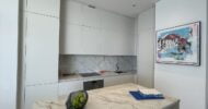 Attention to detail is paramount, as evidenced by polished marble floors and a kitchen that boasts high-end appliances against an elegant marble backdrop.
