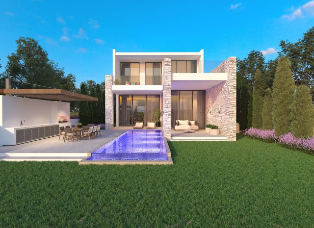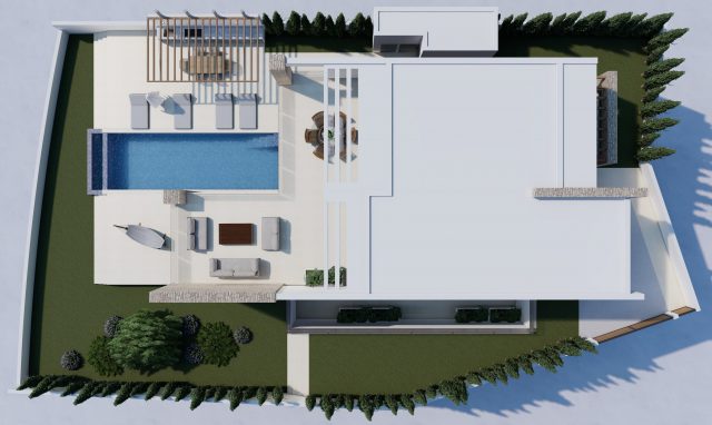 This villa consists of 3 levels connected with a lift and stairs. The ground floor of the villa includes spacious living/dining area, separate kitchen, en-suite bedroom, guest WC. The basement area consists of two double bedrooms (both en-suite), gym, laundry room. The upper floor includes 3 double bedrooms (all en-suite) and large sea view veranda.