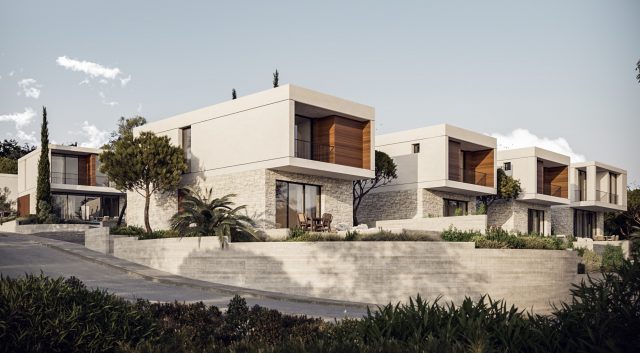 The new project is located in a secluded area near Paphos between Empa and Tala villages and it is all about the view and comfort. The area is surrounded by lush trees and bushes. At the same time, it offers one of the best views in Paphos: the sea and the city. Together with the separated from village area which secures your privacy, it has its convenience. This project is granting easy accessibility to all necessary amenities: international school, supermarkets, seashore, and city centre, consists of 13 villas in luxury lagom design with the traditional use of stone and wood finishes. All of them have their private parking on specious plot of 400 sq.m.