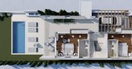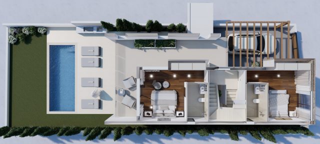 This villa consists of 2 levels with ground floor o includes spacious living/dining area, kitchen, en-suite bedroom, guest WC. The upper floor includes 2 double bedrooms (all en-suite) and large sea view veranda. Roof terrace on the top with great views concludes the property.