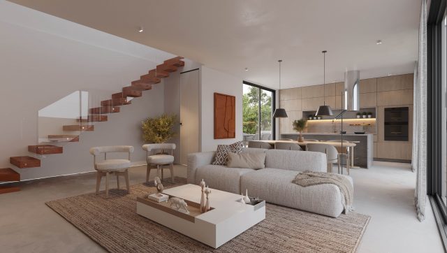 Внутри жители будут наслаждаться простором и комфортом открытой планировки, где тщательно подобранные материалы внутренней отделки, оборудованная кухня и встроенные шкафы создают ощущение сдержанной элегантности.