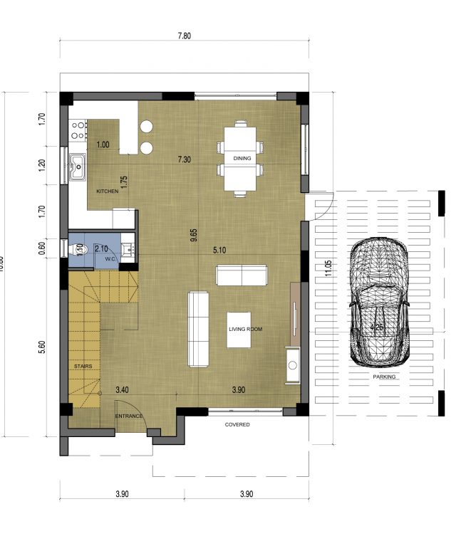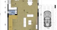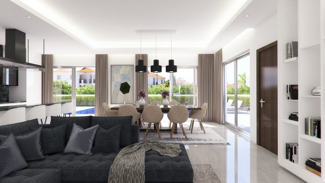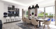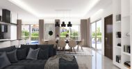 Жилая площадь: При входе на виллу вас встречает просторная и хорошо освещенная гостиная. Большие окна и стеклянные двери позволяют естественному свету наполнять интерьер, создавая яркую и воздушную атмосферу. Гостиная плавно переходит в обеденную зону, которая идеально подходит для семейных посиделок и приема гостей.