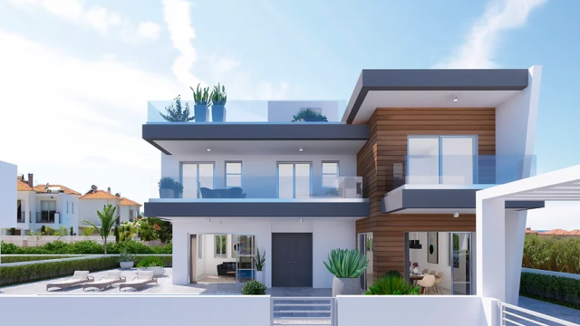 Внешний вид: Вилла имеет современный архитектурный дизайн с четкими линиями и со вкусом оформленной цветовой гаммой. Вилла окружена ландшафтным садом, что создает спокойную и уютную атмосферу. На частную террасу на крыше можно подняться по лестнице, откуда открывается панорамный вид на окрестности, включая потрясающий вид на море.