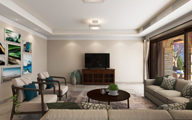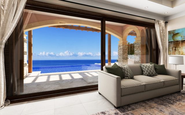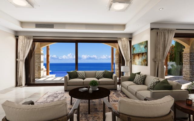 Beyond this is a generously-sized sitting room with panoramic glass doors opening out on to the veranda with captivating sea views and beautifully landscaped gardens with large terraces.