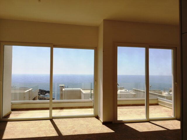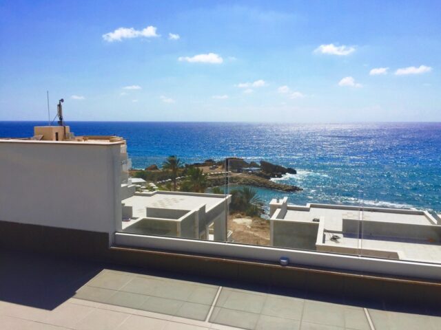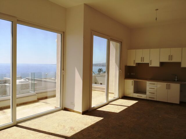 The luxury complex is located on the first line from the sea in Paphos, near the picturesque bay with the sandy beach. For sale three bedroom penthouse with individual entrance and elevator. There is a private indoor parking. High class finishing materials, UPVC windows and balcony patio doors with mirror tint, personal roof terrace.