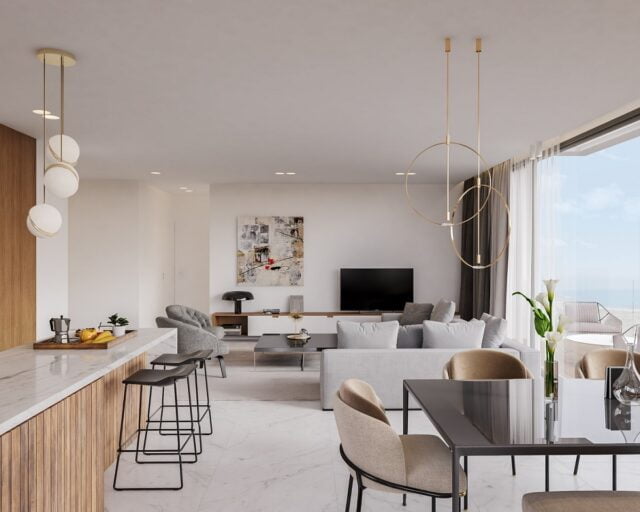 Жилой блок предлагает апартаменты с 1 и 2 спальнями, их общая крытая площадь включая веранды варьируется от 62 кв. м до 150 кв. м. Все апартаменты высокотехнологичны, оборудованы современной мебелью и имеют большие балконы и веранды, откуда открывается великолепный вид на море. На территории есть частная закрытая парковка, резиденция охраняется, обеспечивая безопасность на высшем уровне.