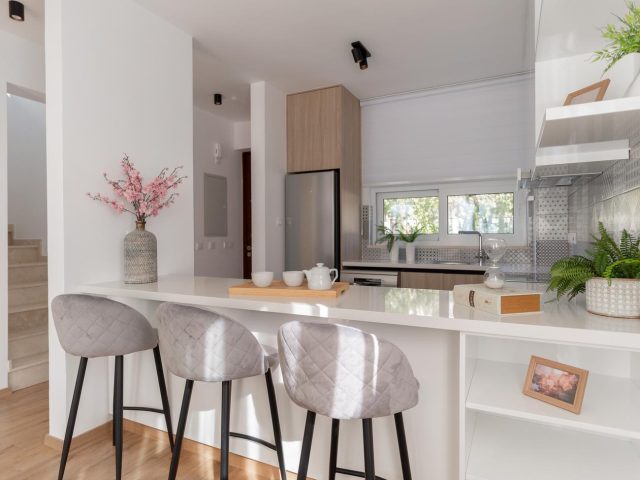 When entering a villa through covered entrance, spacious living spaces on the ground floor incorporate a fully equipped kitchen with a dining area and a modern living room, there is also a guest WC on this level. The upper floor includes three bedrooms and two spacious bathrooms. The residents of this villa have the advantage of using their private swimming pool.