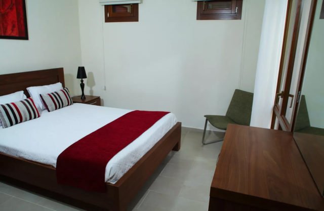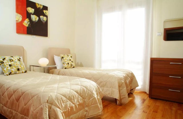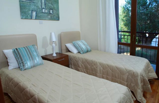 The second and third bedrooms are just a few steps above the ground floor and boast a shared marble bathroom with bath, shower, vanity unit and toilet. These bedrooms feature two twin beds each, bedside cabinets with lamps, fitted wardrobes and cupboards.