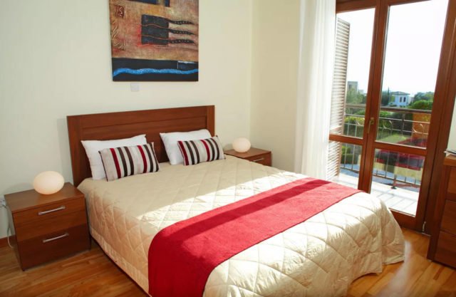 The master bedroom is located on its own on the first level and features a double bed, bedside cabinets with lamps, fitted wardrobe and an en-suite marble bathroom with a vanity sink, bath with shower and a toilet. The double French doors lead to the outside veranda, which offers uninterrupted views of the crystal waters of the Mediterranean Sea.