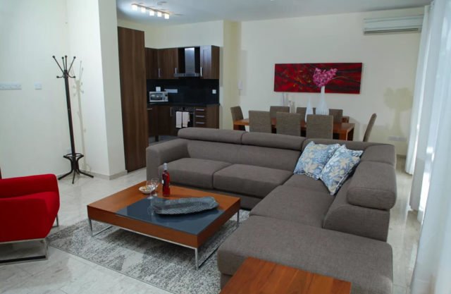 The open plan lounge is furnished with a large, comfortable and contemporary, fabric sofa. The dining area can comfortably seat eight persons. The kitchen features a refrigerator, microwave, electric oven and hob and a fitted dishwasher.