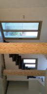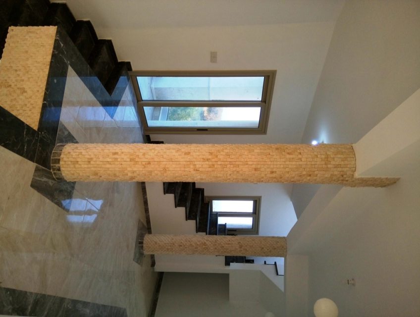 Вход в дом начинается с большой гостиной, слева от нее находится столовая с кухней открытого плана. На этом же уровне большая веранда с видом на лес и море. Из небольшого холла лестница ведет на средний уровень, где расположены три спальни (главная с гардеробной и санузлом) с балконами, ванная комната.