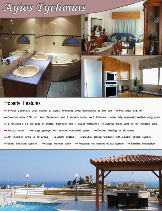 Three-level villa built in one of the elite areas of Limassol – Agios Tychonas (Saint Tikhon), a 15-minute walk to the beach. Due to its location on a hill from the house offers a magnificent view of the sea.